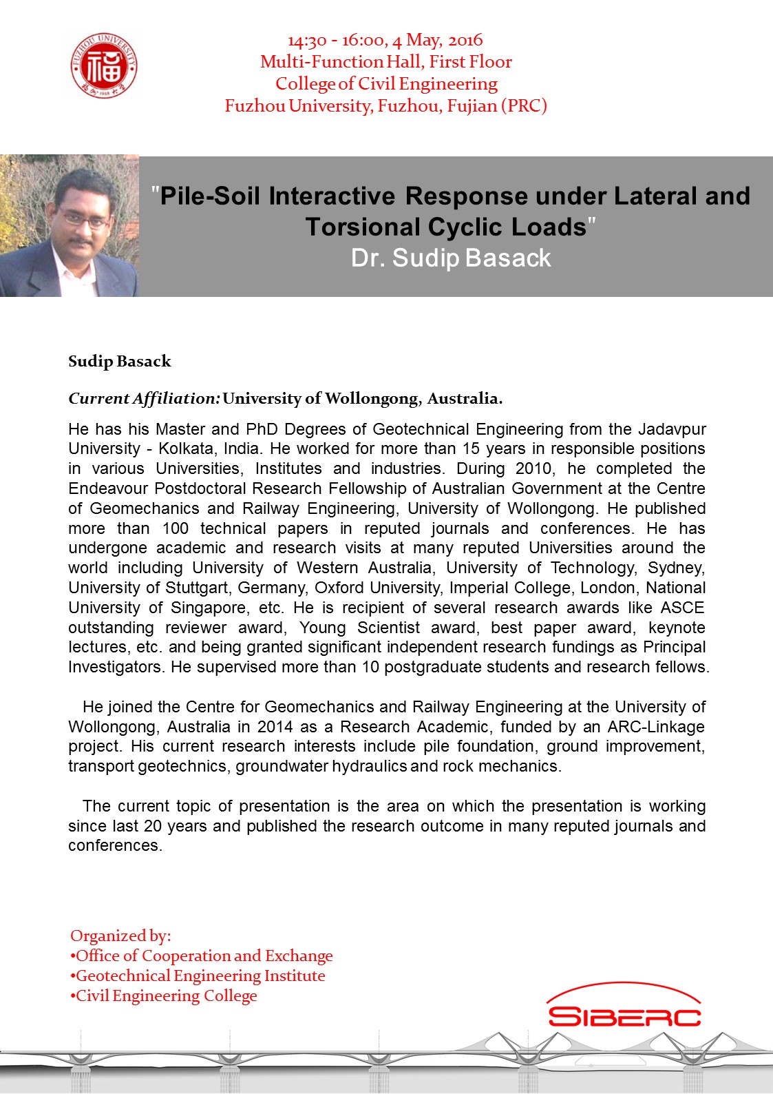 2016年5月4日下午14:30 - 16:00, 在福利吧 一楼多功能厅举办澳大利亚卧龙岗大学Sudip Basack博士关于“Pile-Soil Interactive Response under Lateral and Torsional Cyclic Loads”讲座,欢迎大家参加!
